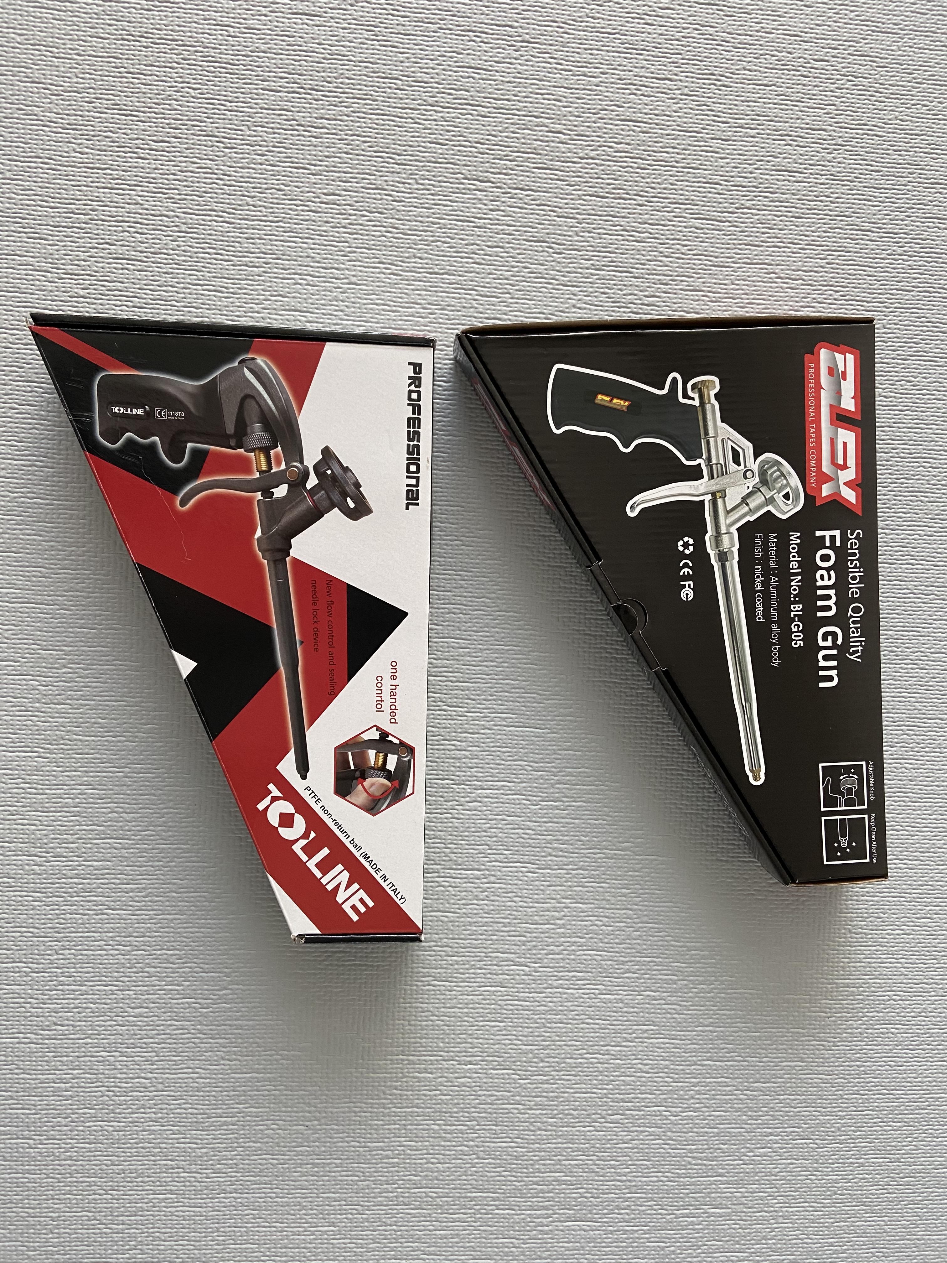 하나는 폼 본드용, 하나는 우레탄 폼 용. 폼 본드 사용 후에는 폼건 세척을 피할 수 없기 때문에 저렴한 버젼으로, 우레탄 폼은 6개월 가량 세척없이도 사용할 수 있다고 하여, 코팅되어 있는 고급형을 샀다.