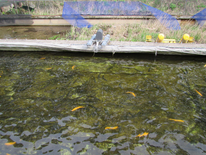 콩가루와 함게 비벼 먹게 되어 있는 야채도 송어회와 무척 잘 어울린다. 회를 금방 먹어치우고 송어 양식장을 보러간다.