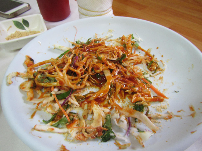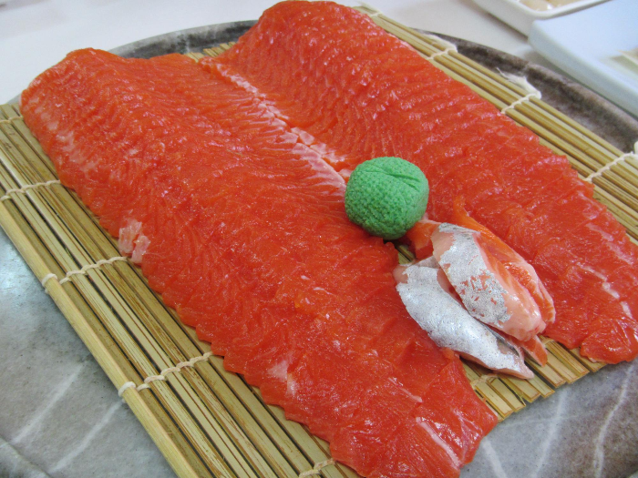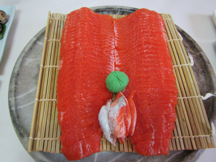 실내로 들어가니 사람들이 가득차 있었다. 인제를 돌아다닐 때에는 그렇게 보기 힘든 사람들이 여기 다 숨어있었나. 자리에 앉아서 송어회2인분을 시키니 송어회 2인분 1kg이 금방 나왔다. 2인분 35000원. 접시위의 송어회를 보고 또 부산 사람은 놀랄 수 밖에 없었다. 연어회보다 훨씬 더 진한 빨간색의 송어 회가 덜렁 놓여있는걸 보니, 흰색살 생선만 회로 먹는 부산 사람에게는 문화충격이었다. 살이 빨간 생선을 회로 먹다니..