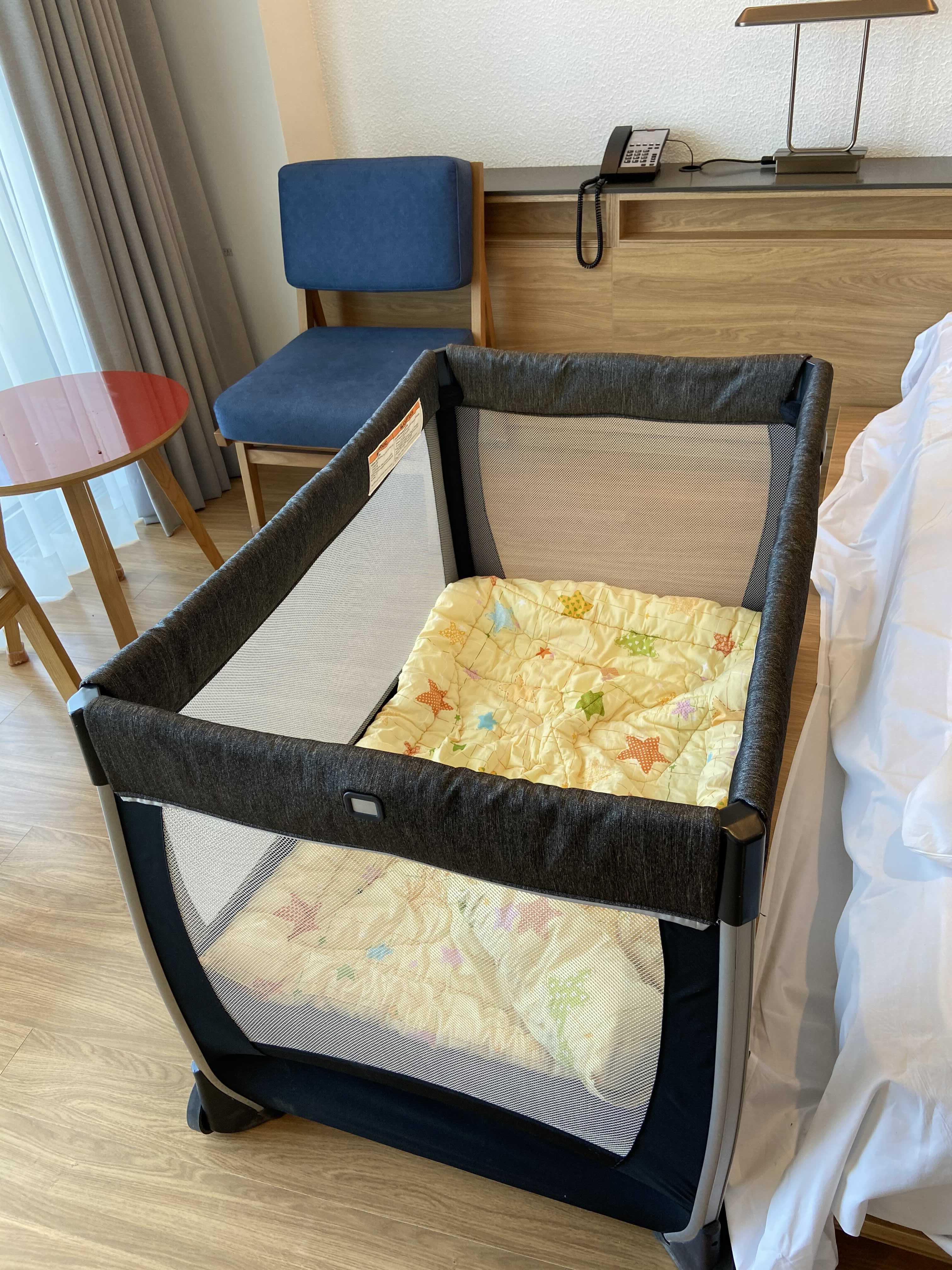예약시 신청했던 아기침대는 미리 준비되어 있다. 튼튼하고 깔끔한 아기침대