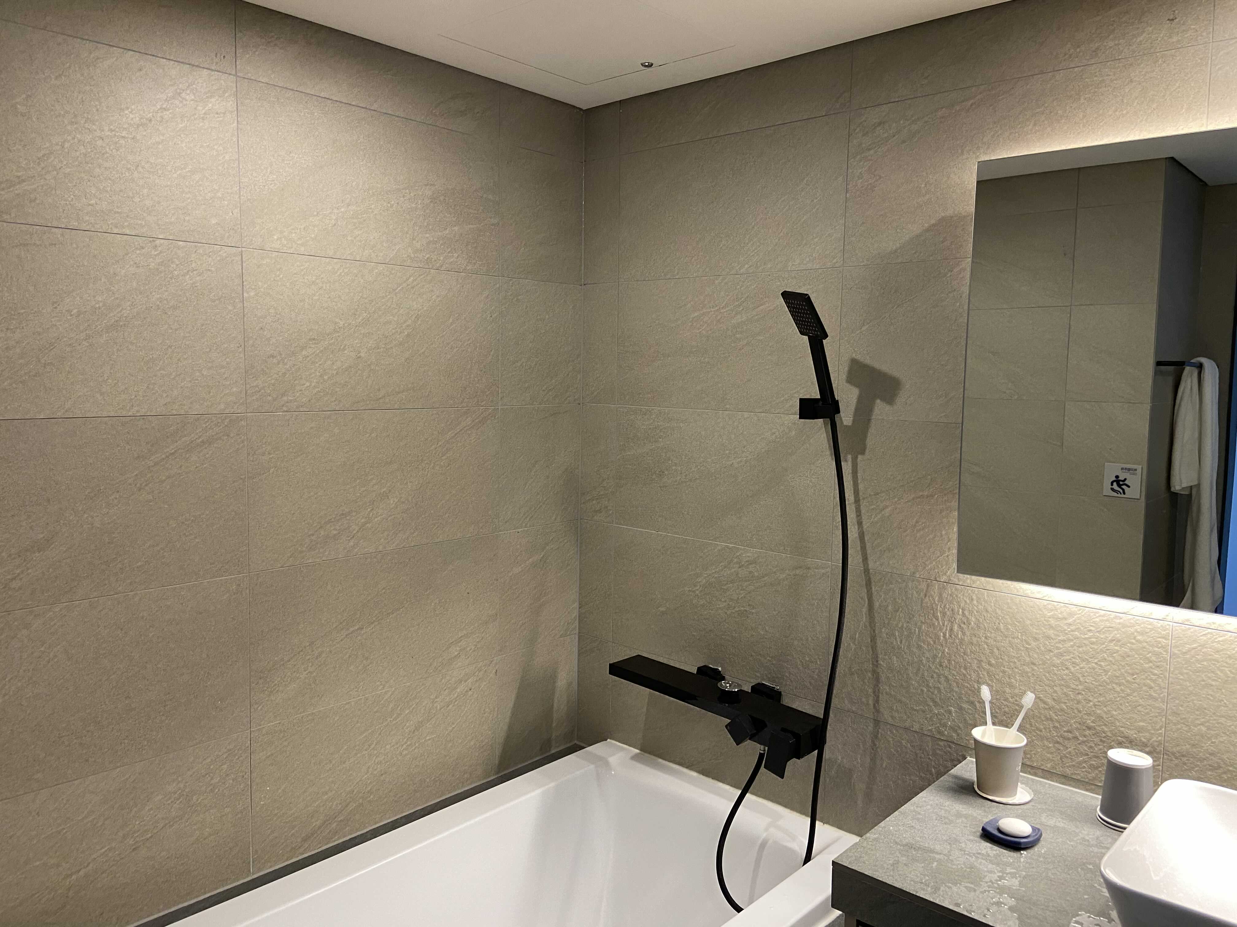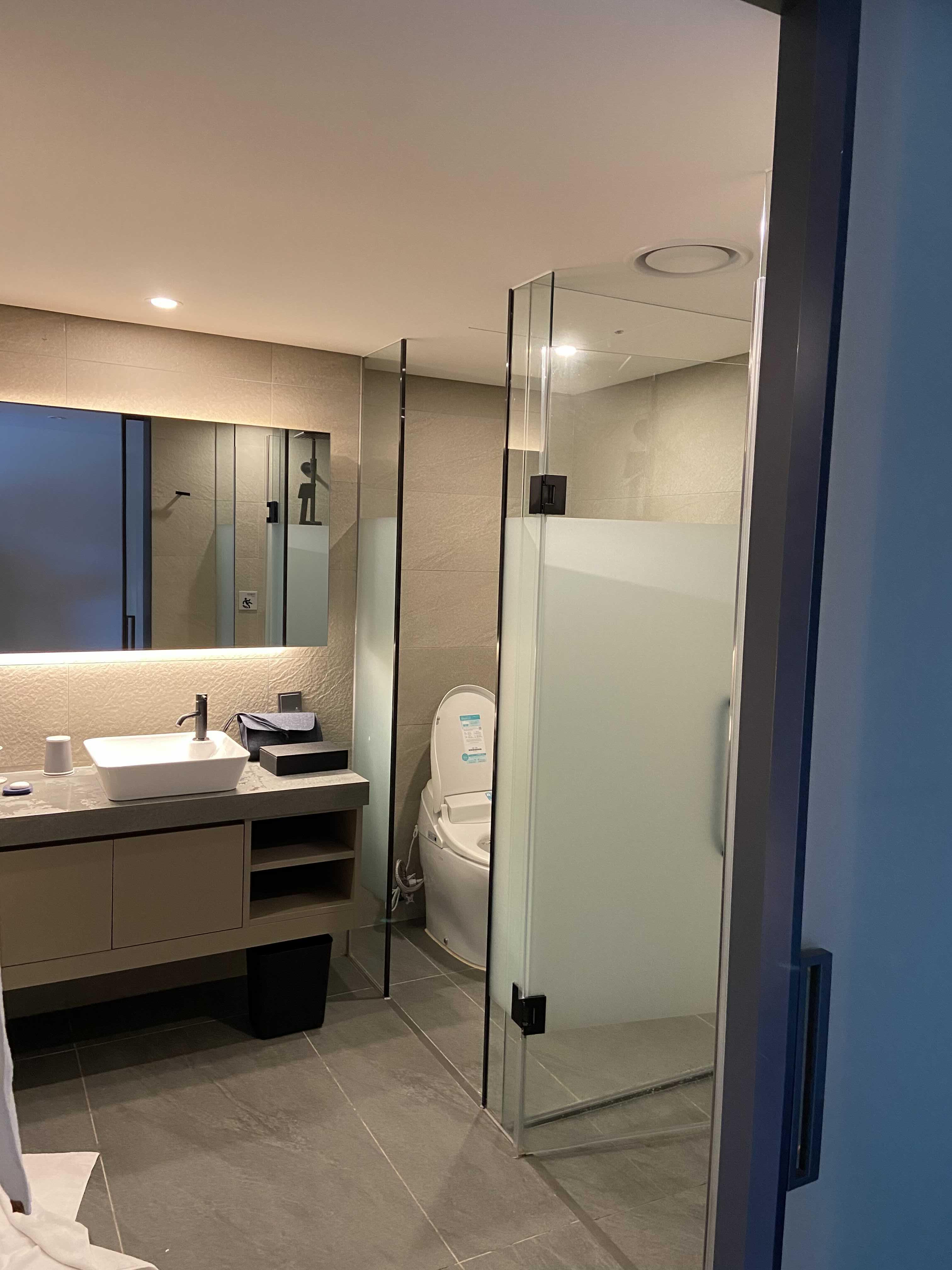 화장실은 전반적으로 호텔의 화장실과 크게 다르지 않고, 바닥재의 소재, 벽채의 소재, 세면대의 소재에도 편안함이 있다. 불특정 다수가 사용해도, 유지될 수 있는 청결함과 시간이 지나도 유지되어야 하는 세련된 감각. 검은색으로 통일 되어있는 샤워기나 수전은 디자인은 예쁘지만, 곧 색상이 벗겨지고 내부의 소재가 드러난다. 수전은 다른 색상이 아무리 예뻐도 스테인레스로 해야하는 것 같다.