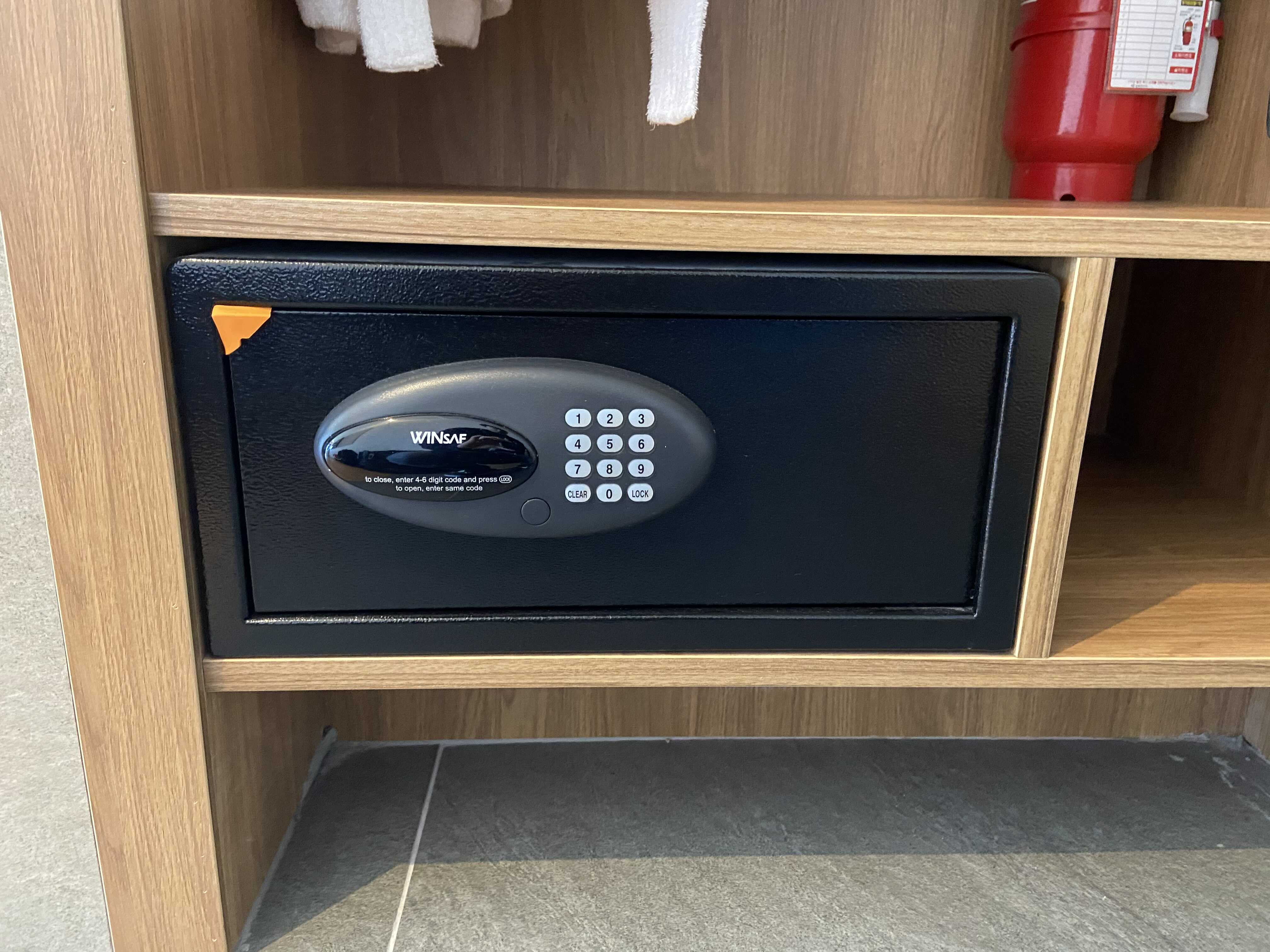 문이 없는 옷장까지는 그렇다 치고, 소화기의 위치에 대해서는 호텔이 다시 고려해봐야 한다. 소화기의 손잡이는 여러가지로 돌출된 부위가 많아서, 고객들이 이를 신경쓰지 않고, 옷 걸이에 긴 코트를 사용한다면, 소화기가 걸려서, 앞으로 넘어지는 경우에는 고객의 발이 다칠 수도 있어보였다. 그리고, 원하지 않게 소화기가 발사되는 경우도 있을 수 있다. 아마 이미 여러번 경험이 있는지, 소화기 안전핀 부분에 다른 잠금장치가 설치되어 있었다. 객실내 물품 위치 선정의 실패라 볼 수 있다.
