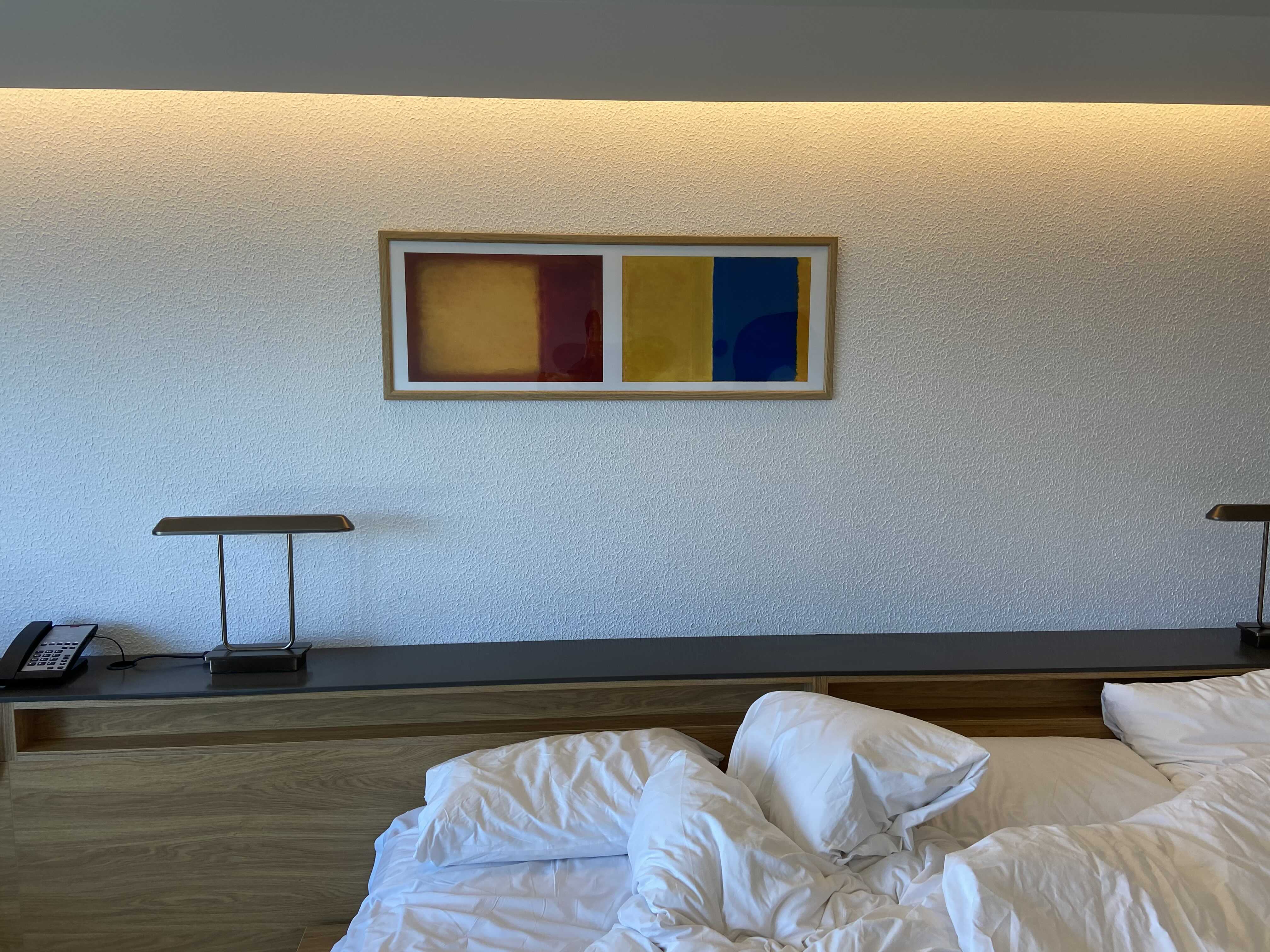 오래된 건물이라 각종 전선이나 설비등을 매립을 깔끔하게 하면서, 고객의 편의를 위해서 침대 머리쪽으로 긴 장이 설치가 되었다. 좋은 선택이라 생각하고, 침대 머리맡의 긴 선반을 설치하면서, 침대 옆의 협탁이 없어도 되는 좋은 선택으로 보인다. 그리고, 긴 선반 형태의 장 위로 놓이는 램프는 깔끔하면서 단정한 인상을 준다.
