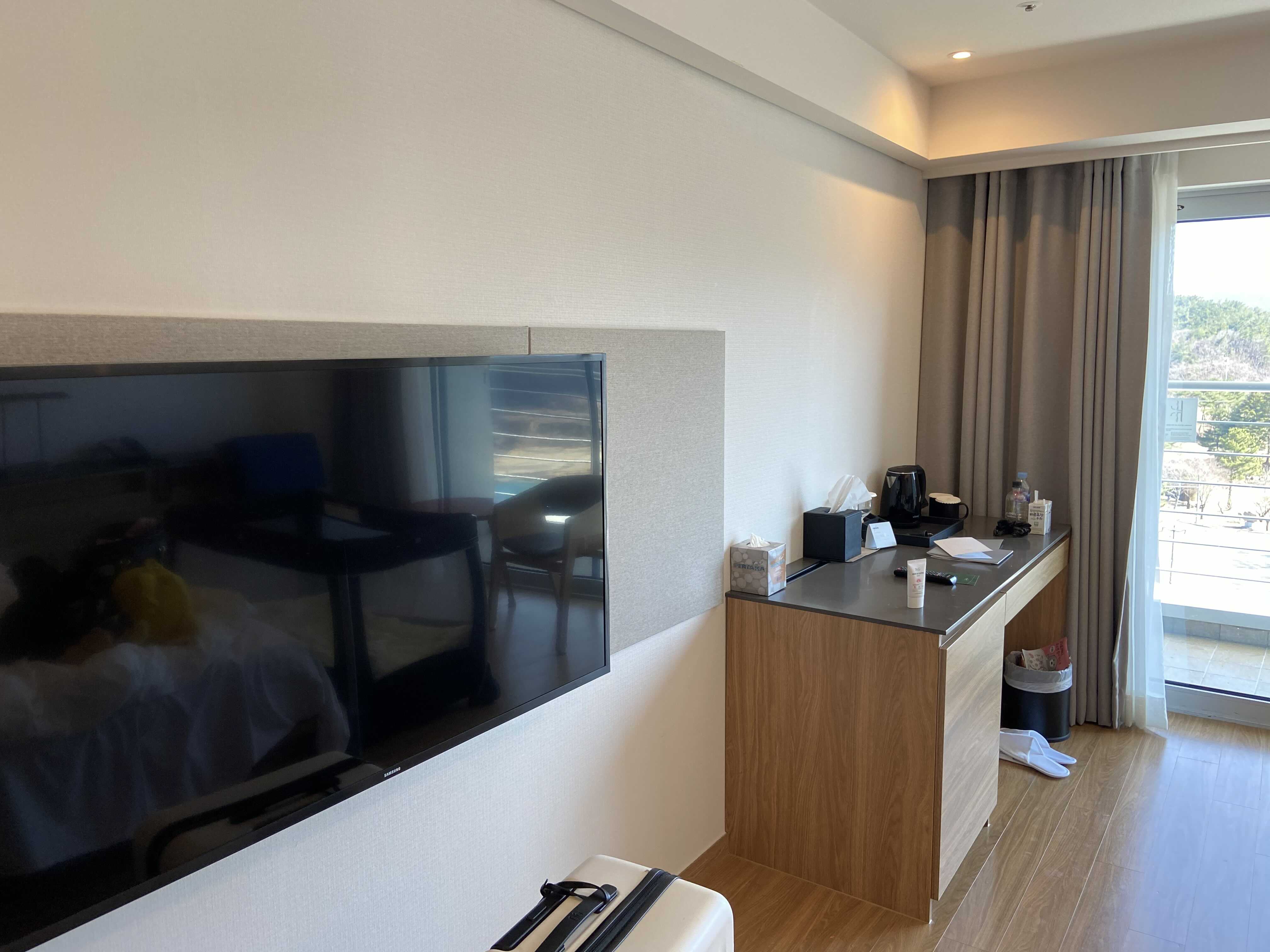 사라진 미니바의 물품들은 방에 설치된 데스크로 들어갔다. 책상 왼쪽에 매립형 소형 냉장고, 그리고, 기본으로 선물해주는 물은 사람을 기분좋게 만든다. 아마 미니바가 없어지면서, 고객들의 체크아웃도 간단하게 바뀌었겠지. 기본으로 구성되는 커피와 녹차, 홍차, 두개의 머그컵과 커피포트.