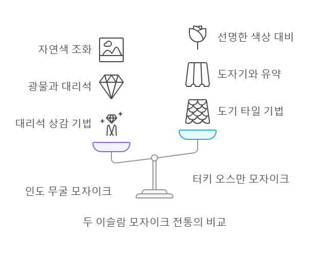 제작 기법 측면에서 무굴 모자이크는 주로 대리석에 보석이나 돌을 끼워넣는 상감기법과 색유리·거울 조각 붙임 등을 즐겨 쓴 반면 (Sheesh Mahal (Lahore Fort) - Wikipedia) (Tomb of I'timād-ud-Daulah - Wikipedia), 오스만 모자이크는 도기 타일에 그림을 그려 구워낸 패널을 조합하거나 초기에는 색타일 조각을 짜맞추는 기법이 중심이었습니다 (İznik Vakfı) (Iznik pottery - Wikipedia). 이에 따라 재료도 인도는 옥·마노·청금석 같은 광물과 대리석, 유리, 금박 등을 활용했고 (Tomb of I'timād-ud-Daulah - Wikipedia), 터키는 석영 함유 도자기 태토로 만든 타일과 유약, 안료를 주로 사용했습니다 (İznik Vakfı) (İznik Vakfı).